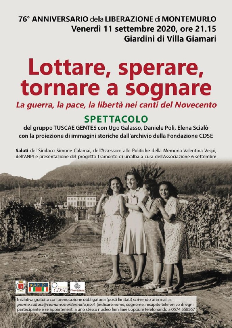 Anche quest'anno, nonostante l'emergenza sanitaria Covid-19, venerdì 11 settembre il Comune di Montemurlo festeggia il 76esimo anniversario della Liberazione di Montemurlo dall'occupazione nazi-fascista. Le celebrazioni si aprono la mattina alle ore 11 in piazza Donatori del Sangue con la deposizione di una corona d'alloro al monumento ai caduti da parte del sindaco Simone Calamai. In serata alle ore 21.15 nel parco di Villa Giamari (piazza Don MIlani, 1- Montemurlo) le celebrazioni continuano con “Lottare sperare, tornare a sognare. La guerra, la pace, la libertà nei canti del Novecento”, uno spettacolo in cui i canti di protesta e di libertà di patrioti e partigiani si intrecciano con le immagine d'epoca del territorio. Partecipa il gruppo Tuscae Gentes con Ugo Galasso (flauti, ocarine, clarinetto, piffero) Daniele Poli (chitarra, armonica a bocca, duddero, voce), Elena Scialò (voce). Nel corso della serata saranno proiettate delle foto storiche dell'archivio Cdse. L'evento è gratuito ma per partecipare è necessaria la prenotazione obbligatoria telefonando al numero 0574 558567 o scrivendo a promo.cultura@comune.montemurlo.po.i
