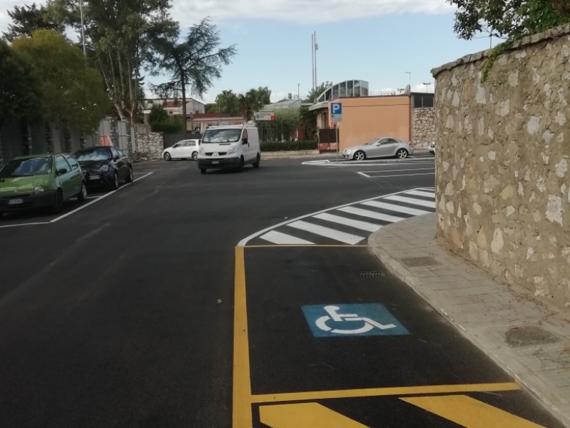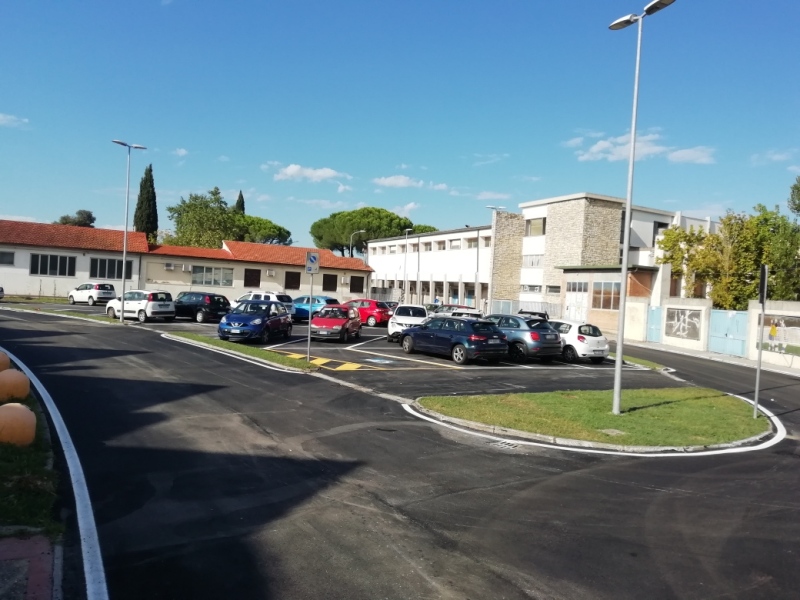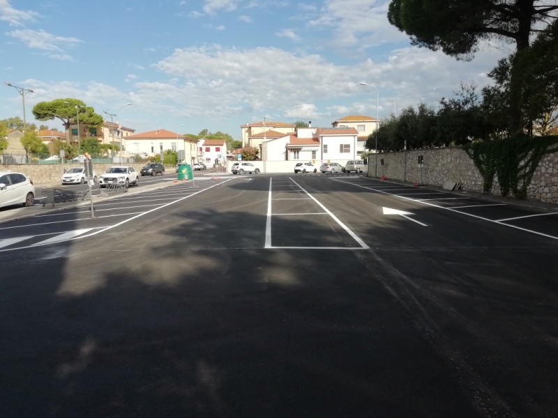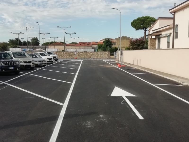 Terminate le operazioni di asfaltatura, nel parcheggio è stata ripristinata la segnaletica orizzontale per la regolamentazione della sosta, ridisegnando gli spazi: sono stati quindi realizzati 108 stalli per le auto e 21 stalli per i ciclomotori.