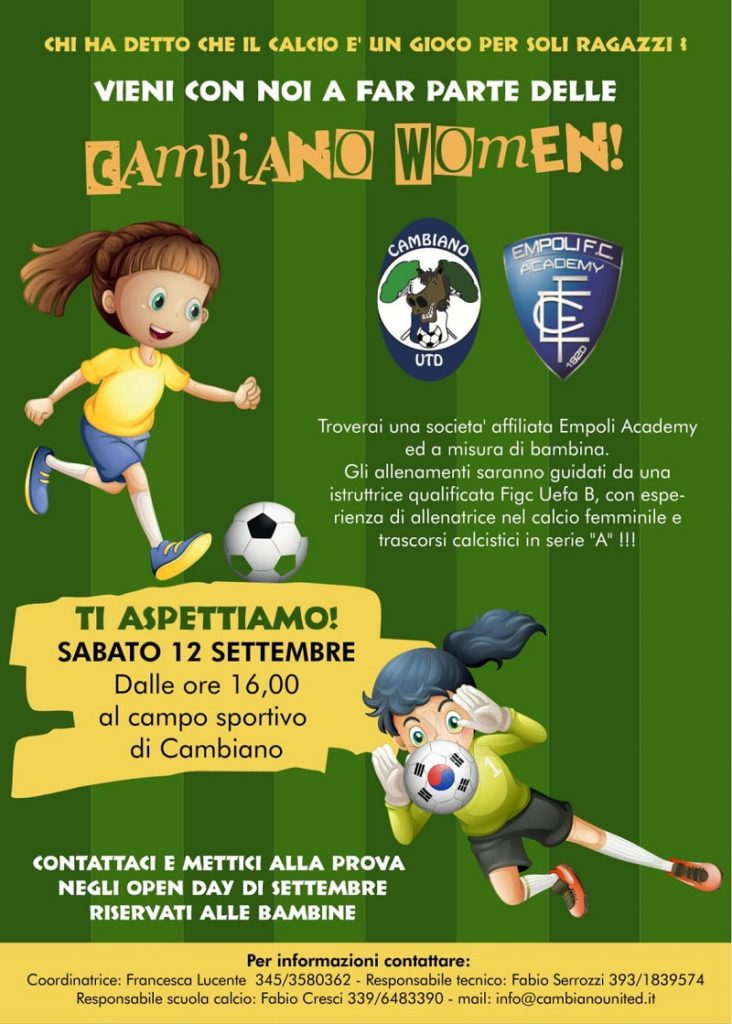 La società sportiva FBC Cambiano United sta buttando le basi per creare almeno una squadra di calcio femminile. Sabato 12 settembre alle 16, al campo sportivo di Cambiano ci sarà un Open Day dedicato interamente al calcio femminile, aperto a bambine e ragazze. La giornata, totalmente gratuita, sarà seguita dall'istruttrice castellana Francesca Lucente, qualificata UEFA B, che arriva dall'esperienza in panchina nella passata stagione con la Primavera della Florentia Women mentre da giocatrice, vanta un lungo trascorso che l'ha vista protagonista sui campi toscani fin da piccolina dove, con il Membrino ha iniziato a tirare i primi calci al pallone, fino ad arrivare alla Serie A con la maglia della Scalese. Da quest'anno la Lucente farà parte dello staff allenatori della società valdelsana, fortemente voluta dal responsabile dell'area tecnica Fabio Serrozzi che è convinto che il suo arrivo possa dare un valore aggiunto alle ambizioni di crescita del Cambiano Utd, forte già della confermata collaborazione con l'Empoli Fc, attraverso il progetto tecnico Empoli Academy. In virtù di tutto ciò, per l'avvio del progetto femminile, il Cambiano ha avviato una collaborazione con l'Empoli Ladies. Il compito di Francesca all'interno della società verdeblu, sarà quello di coordinatrice e istruttrice del progetto Cambiano Woman, oltre che avere un ruolo da collaboratore nello staff tecnico dei Piccoli Amici. Dopo il 12 settembre ci saranno altre iniziative legate al progetto di calcio femminile.