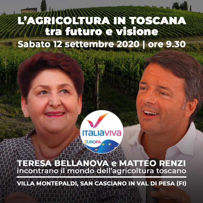 “L’agricoltura in Toscana tra futuro e visione”. E’ il tema dell’iniziativa in programma sabato 12 settembre alle 9.30 a Villa Montepaldi (San Casciano Valdipesa, Fi). Teresa Bellanova, ministro per l’agricoltura e Matteo Renzi, senatore e leader di Italia Viva, incontreranno i rappresentanti del mondo dell’agricoltura.