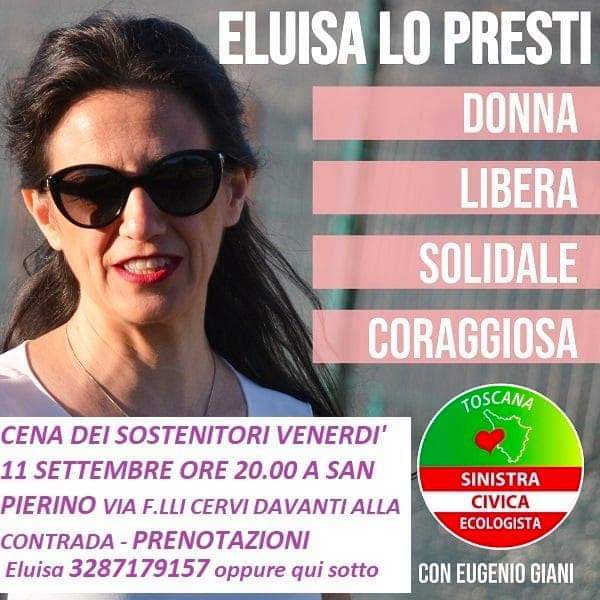 L’impegno del comitato questi ultimi giorni di campagna elettorale continua, con volantinaggi informativi ed incontri con i cittadini. In particolare è prevista per domani sera, venerdì 11 settembre ore 20 a San Pierino a Fucecchio una cena di finanziamento dei sostenitori di Eluisa Lo Presti e di Sinistra Civica Ecologista (via f.lli Cervi davanti alla Contrada); prenotazioni al 3287179157