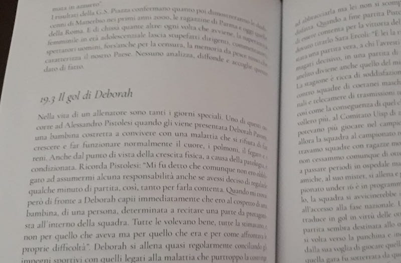 In una parte del racconto, mister Pistolesi ricorda Deborah, giovane di Staffoli (Santa Croce sull'Arno) scomparsa quasi venti anni fa. Negli anni Novanta Pistolesi allenava il Valdarno e aveva in squadra Deborah: nel libro parla di due suoi gol, uno in particolare, che tuttora l'allenatore porta con sé come ricordo.