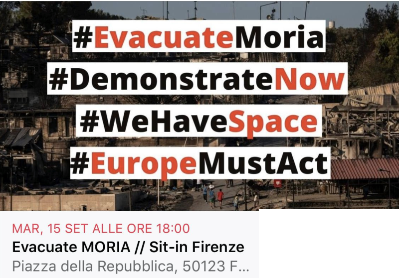 Martedì 15 settembre, a Firenze in Piazza della Repubblica, alle ore 18:00, EVACUATE MORIA Sit-in organizzato dal Movimento europeo Europe Must Act* attraverso Italy Must Act*