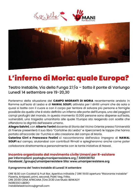 Lunedì 14 settembre dalle ore 19:00 alle ore 20:30, presso il Teatro Instabile a Firenze in via della Funga, 27/a, si svolgerà un incontro organizzato dal Movimento civile Umani per R-esistere, sulla situazione del Campo migranti di Moria, recentemente andato in fiamme sull’isola di Lesbo e di Nawal Soufi, attivista dei diritti umani che, da sola o quasi, si batte “con il cuore e con il corpo” per tentare di salvare più persone e famiglie possibile da quello che è stato definito “un inferno alle porte dell’Europa”, “uno dei peggiori campi profughi del mondo”. In questo momento 13.000 persone sono disperse sull’isola, vulnerabili. È una tragedia umanitaria alla quale l’Europa sta reagendo con scelte che offendono la dignità dell’essere umano.
