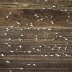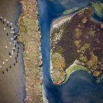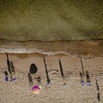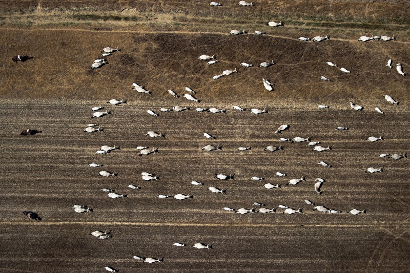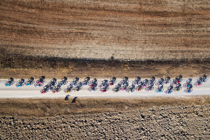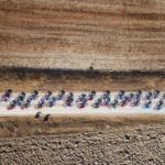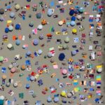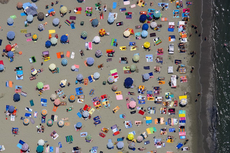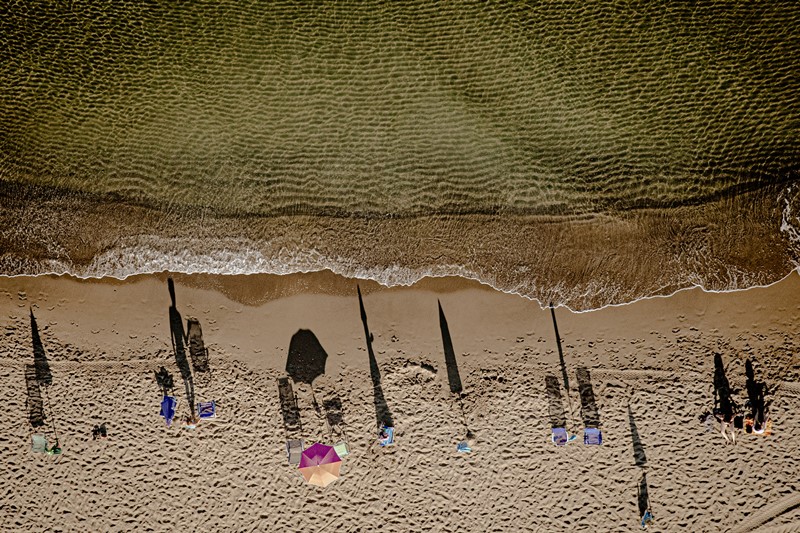 Spesso i paesaggi ritratti non sono riconoscibili, sembrano quadri, con pennellate di colori diversi o composti da tessuti sovrapposti. Impasti materici che s’impongono nel loro essere astratti, richiamando alla mente opere di artisti e non luoghi reali. E anche quando la scena fotografata è riconoscibile per quello che è – una gara ciclistica, alcuni butteri con la loro mandria di mucche, una fila di carrelli davanti al supermercato durante il lockdown o dei bagnanti su una spiaggia – le ombre proiettate accanto alle minuscole figure umane o animali, ridotte quasi a punti di colore, sembrano far germinare fantasmi sul paesaggio, e fanno pensare ai giochi creati da un’antica lanterna magica, perché alla fine anche la tecnologia più estrema può essere al servizio dell’emozione e della meraviglia, riportando chi guarda al mondo della magia e dell’infanzia.