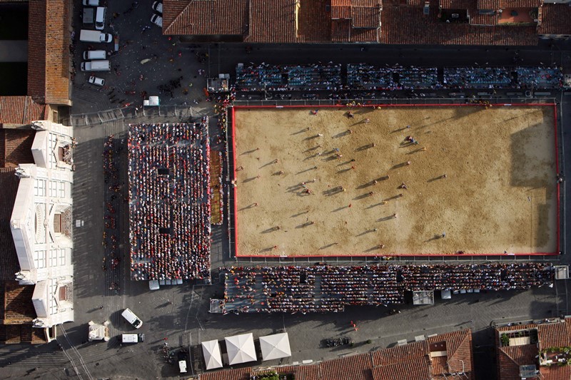 Per il direttore di FST i formati giganteschi che esaltano gli sguardi impossibili e le visioni zenitali di Massimo Sestini svelano la natura più intima e naturale del paesaggio toscano, al punto da scoprirne le nervature più nascoste e commoventi. Chi salirà sui bastioni del Forte non troverà una replica di quel repertorio di immagini, pur bellissime e suggestive, che hanno contribuito ad affermare in tutto il mondo il mito del paesaggio toscano. Entrerà in contatto con le parti più sconosciute e inesplorate del mito; geometrie, tonalità, volumi, chiaroscuri mai visti prima, senza alcun artificio che corrompa l’essenza più intima della Toscana, modellata dalla fatica dell’uomo e da una saggezza millenaria.