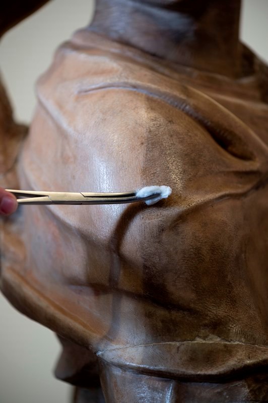 Sulla base di questi risultati è stato deciso di procedere prima con delle prove di pulitura, così da individuare la metodologia più idonea, e poi di iniziare l'intervento dal retro, dove era maggiore la presenza di depositi, utilizzando tamponi di cotone imbevuti di acqua deionizzata, leggermente riscaldata. Un metodo non invasivo, graduale e controllato.