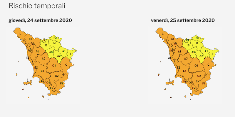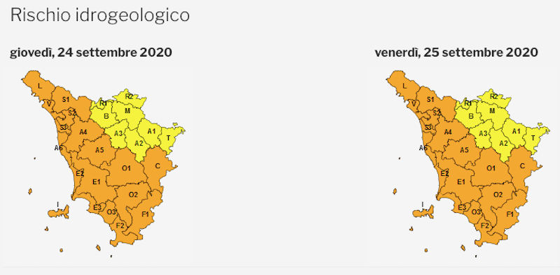 Il Centro funzionale di monitoraggio meteo della Regione Toscana ha emesso un avviso di criticità meteorologica arancione su quasi tutte le province della Toscana. In particolare sulla provincia di Lucca è in corso un allerta gialla per per forti temporali e rischio idrogeologico e idraulico sul reticolo minore; dalle ore 18 di oggi (giovedì 24) fino alle ore 3 di domani (venerdì 25 settembre) allerta arancione per forti temporali e rischio idrogeologico e idraulico sul reticolo minore.