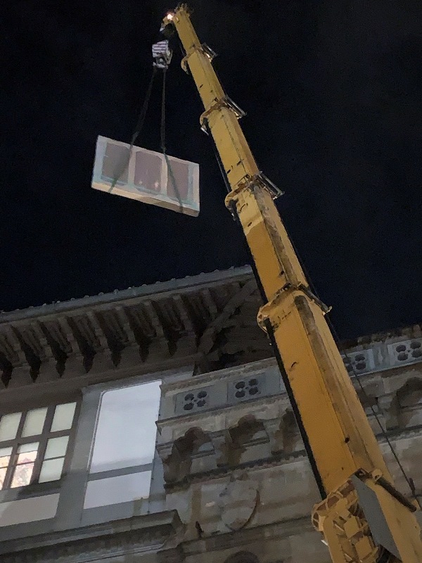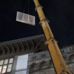 Ieri notte è arrivato agli Uffizi il capolavoro della National Gallery di Londra “Esperimento su di un uccello inserito in una pompa pneumatica”. Proprio con un breve "volo controllato" l’opera è stata trasportata da una gru al secondo piano, sul terrazzo della Galleria sotto gli sguardi di tanti curiosi attirati dalla spettacolare movimentazione. Le operazioni sono state dirette dalla dottoressa Alessandra Griffo, capo dipartimento Mostre e curatrice dell’evento espositivo.