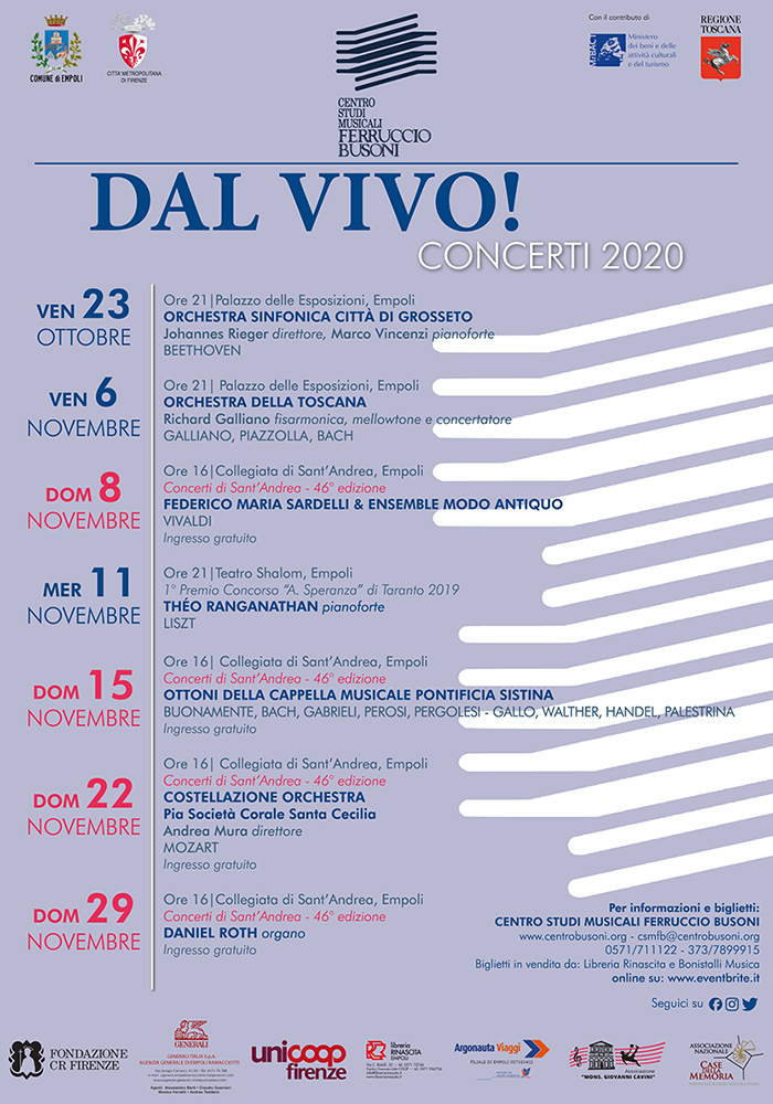 Grazie al sostegno fondamentale del Comune di Empoli, e anche della Città Metropolitana di Firenze, altro socio fondatore del Centro e ai contributi del Ministero per i Beni e le Attività Culturali e per il Turismo e della Regione Toscana, può partire questa prima parte della stagione concertistica 2020/2021, che prevede un’importante novità. Quest'anno, per la prima volta, il Centro Busoni affiancherà l’Associazione “Mons. Giovanni Cavini” nell’organizzazione dei “Concerti di Sant’Andrea”, che da quarantasei anni, nelle domeniche del mese che si conclude con la festa del Santo Patrono (30 novembre), si svolgono nella suggestiva cornice della Collegiata di Sant’Andrea.