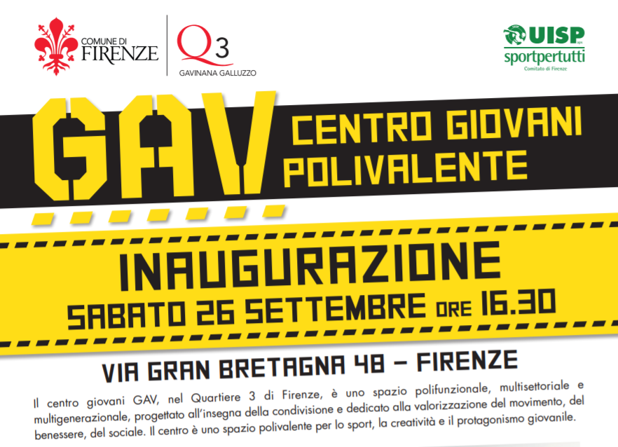 “Il centro polivalente Gav si presenta come uno spazio dedicato ai giovani ma più in generale per tutte le generazioni. Un centro dove si coniugano le esigenze di un’ampia fetta della popolazione” sottolinea il presidente di Uisp Firenze Marco Ceccantini. “Per Uisp è una sfida - spiega Annalisa Saviozzi, responsabile dell’area Formazione Uisp – perché il Centro riapre dopo un periodo abbastanza lungo di chiusura e lo sforzo sarà di coinvolgere i giovani e gli abitanti del quartiere a partecipare alle attività. Molte iniziative proposte durante l’anno saranno gratuite per i giovani tra i 13 e i 19 anni alle quali potranno accedere tramite la card giovani Gav”.
