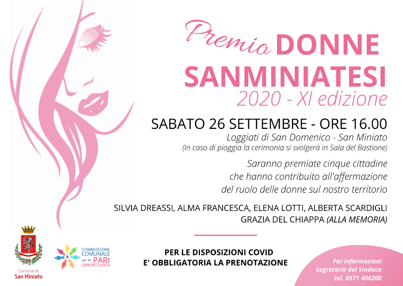 Cinque donne sanminiatesi che si sono distinte nell'ambito professionale o sociale, divenendo figure di riferimento per la comunità locale, saranno le protagoniste della undicesima edizione del “Premio Donne sanminiatesi”. La cerimonia, promossa ed organizzata dal Comune di San Miniato e dalla Commissione pari opportunità presieduta dalla presidente Elise Bianchi, si sarebbe dovuta tenere nel marzo scorso ma, a causa del lockdown, è stata rinviata a sabato 26 settembre, ore 16.00, ai Loggiati di San Domenico.