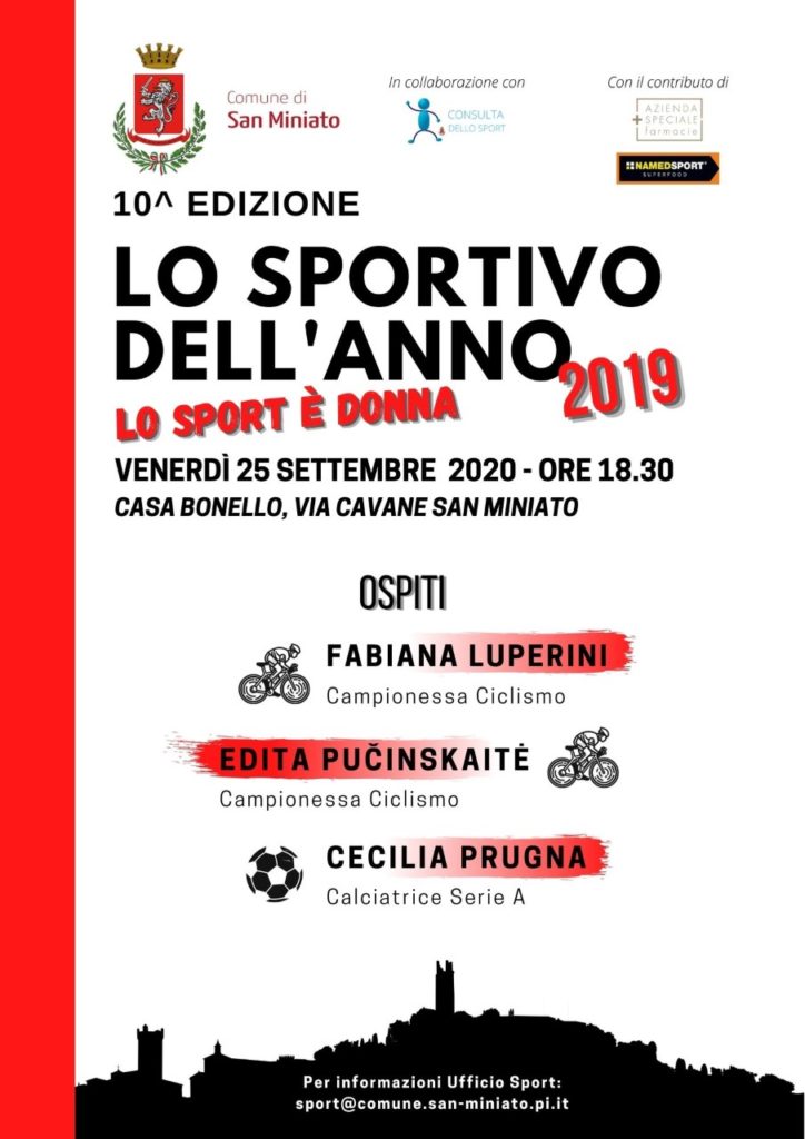 Decima edizione dello “Sportivo dell’anno”, la grande e attesa manifestazione organizzata dal Comune di San Miniato in collaborazione con la Consulta dello sport e con il contributo dell'Azienda Speciale Farmacie e la Named Sport. Venerdì 25 settembre, alle 18.30, all'impianto sportivo comunale Casa Bonello (via Cavane, San Miniato) saranno consegnati i riconoscimenti agli atleti, alle società sportive, ai volontari e ai dirigenti che, nel corso del 2019, si sono particolarmente distinti. Testimonial della serata saranno le ex cicliste Fabiana Luperini Edita Pučinskaitė e la calciatrice centrocampista dell'Empoli Cecilia Prugna. Presentano Giulia Fontanelli e il giornalista di gonews.it e empolichannel.it Gianmarco Lotti.