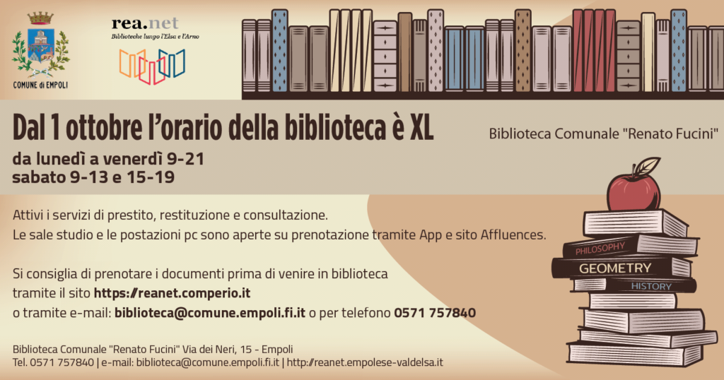 La biblioteca comunale “Renato Fucini” di Empoli amplia ancora il proprio orario di apertura e da giovedì 1 ottobre sarà aperta da lunedì a venerdì dalle 9 alle 21 e il sabato dalle 9 alle 13 e dalle 15 alle 19.