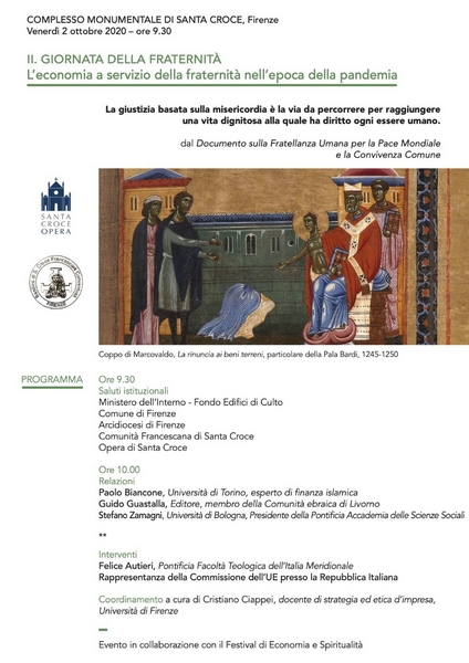 La sfida della seconda Giornata della Fraternità è quella di dimostrare che c’è un’economia possibile, al tempo della pandemia, che può essere messa al servizio dell’uomo. Proprio l’emergenza mondiale che stiamo vivendo rende il cambio di passo irrinunciabile e urgente. L’Opera di Santa Croce con la Comunità dei Frati minori conventuali, in pieno spirito francescano, la mattina di venerdì 2 ottobre chiama a raccolta esperti e rappresentanti delle diverse religioni per un confronto a tutto campo che parte dalle prospettive concrete e ampie aperte dalla Dichiarazione sulla Fratellanza umana di Abu Dhabi, pietra miliare del dialogo tra uomini di fedi religiose diverse.