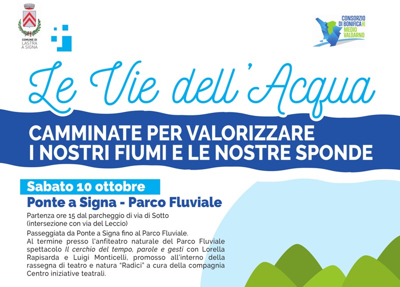 I tre appuntamenti partiranno il prossimo 10 ottobre con la prima camminata da Ponte a Signa fino al Parco Fluviale: la partenza sarà alle 15 dal parcheggio di via di Sotto (intersezione con via del Leccio) e proseguirà fino al Parco Fluviale dove l’evento si concluderà con lo spettacolo teatrale Il cerchio del tempo, parole e gesti con Lorella Rapisarda e Luigi Monticelli, promosso all’interno della rassegna di teatro e natura “Radici” a cura della compagnia Centro iniziative teatrali.