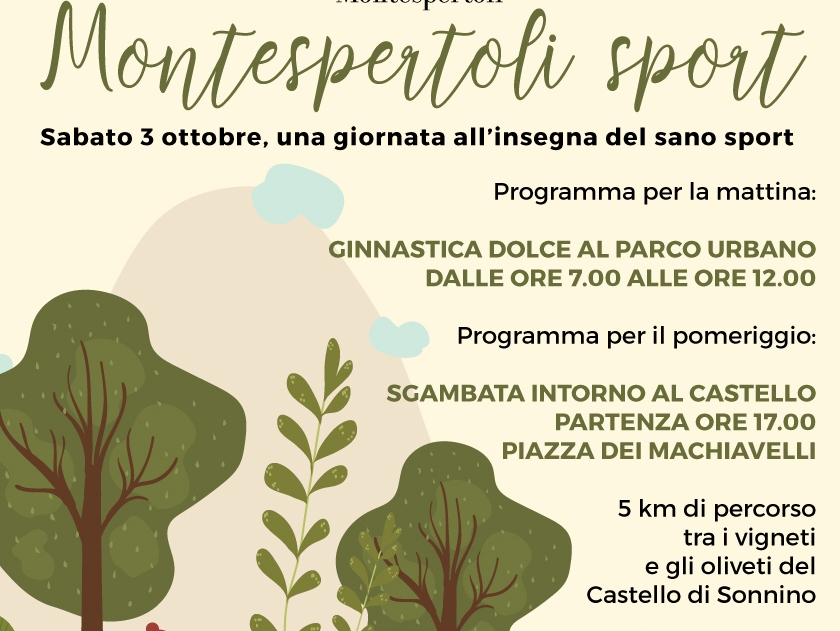 Finesettimana d'autunno ricco di iniziative a Montespertoli. Spostato a sabato 3 ottobre la giornata di sport al Parco Urbano, il programma rimane il solito: la mattina dalle ore 9.30 fino alle ore 12.30 sarà possibile provare le seguenti discipline: total body soft, pilates, tai-chi e yoga.