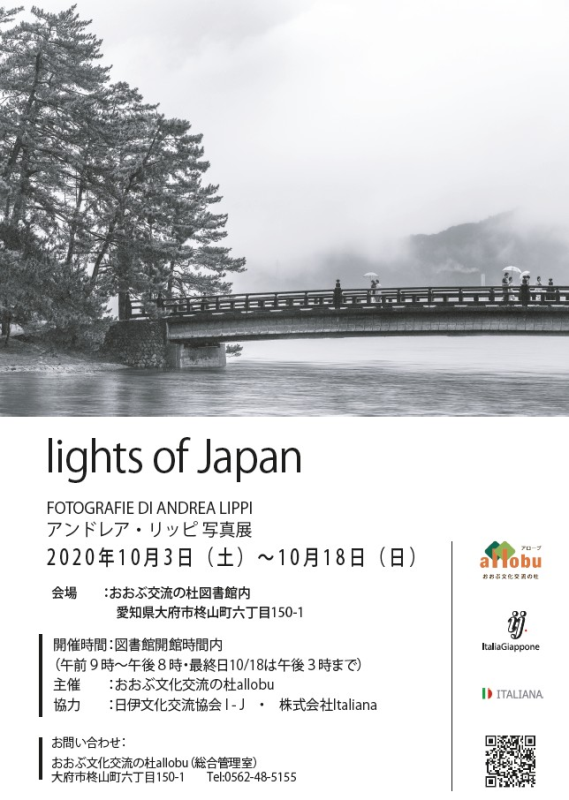 Le fotografie di Andrea Lippi saranno esposte in Giappone, nella città di Obu dal 3 al 17 ottobre prossimi, all’interno della sede della AllObu Library. La mostra, organizzata in collaborazione con AllObu, l’associazione ItaliaGiappone e Italiana.jp è la quarta mostra in Giappone per le opere di Andrea Lippi, tratta dalla serie “Lights of Japan”.
