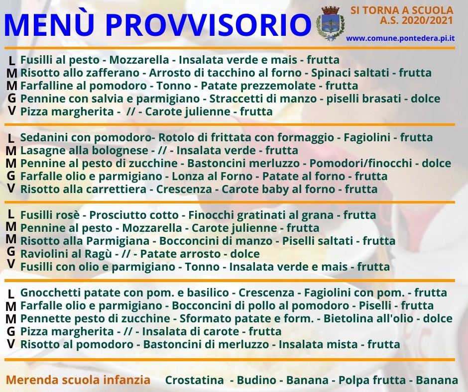 Anche per l’a.s. 2020/21, nonostante l’emergenza sanitaria legata alla diffusione del coronavirus, l’Amministrazione comunale si impegna a garantire, in collaborazione con i Dirigenti Scolastici, un servizio mensa elaborato ed erogato avendo come riferimenti le nuove linee guida emanate dal Comitato Tecnico Scientifico (CTS) istituito dal governo, dal Ministero dell’Istruzione dell’Università e della Ricerca, dal Ministero della Salute e delle indicazioni operative della Regione Toscana e del Comitato Tecnico Scientifico istituito a livello territoriale tra Azienda USL Toscana Nordovest, Enti Locali e Conferenze Educative della provincia di Pisa.