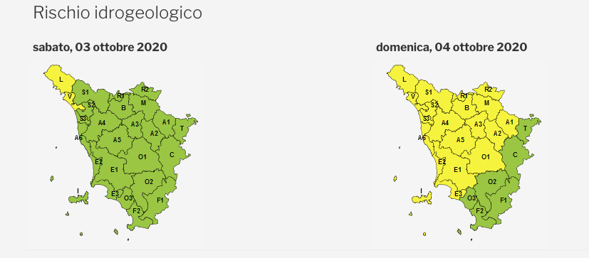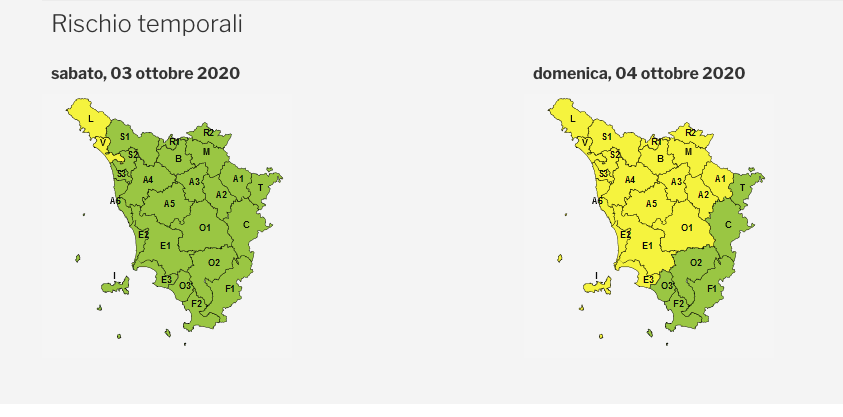 Questi stessi fenomeni si estenderanno nella giornata di domani, domenica 4, al resto della regione – ad esclusione delle aree Valdichiana, Fiora, medio Ombrone grossetano, costa grossetana e  Valtiberina -, con un codice giallo dalle ore 18 fino alle ore 24.