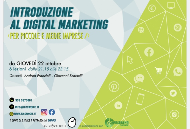 Sono solo alcuni degli obiettivi che si pone il nuovo corso di Digital Marketing rivolto alle piccole e medie imprese locali, organizzato da Il CoWo di E, in collaborazione con Confesercenti Empolese-Valdelsa, che ha deciso di partecipare con entusiasmo alla creazione di questo progetto, mettendo a disposizione la sua conoscenza di lungo corso del territorio empolese.