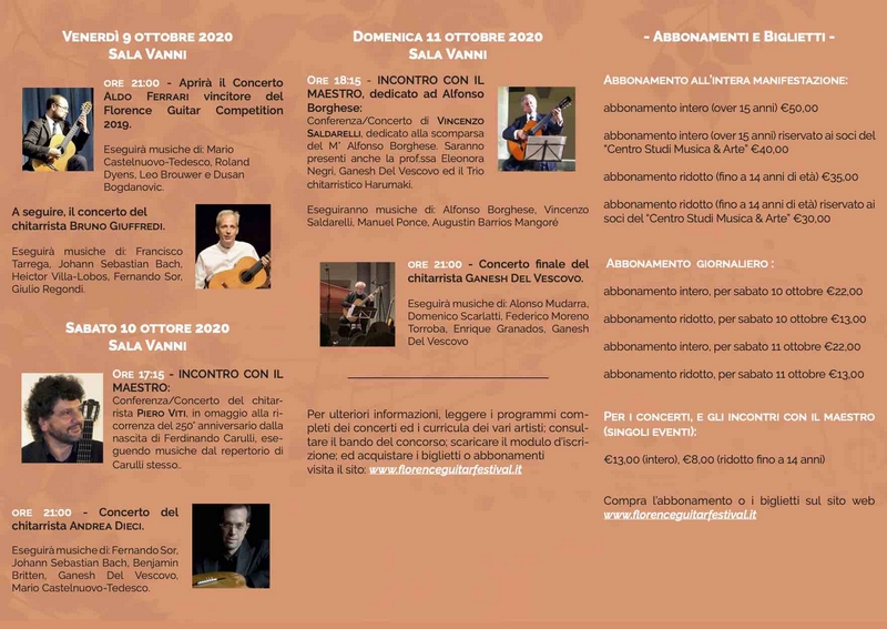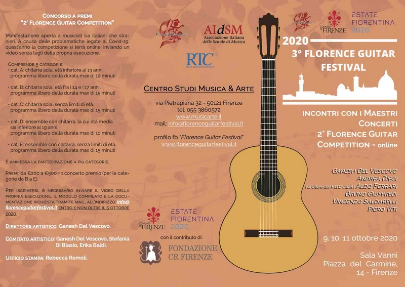 orna con la terza edizione il Florence Guitar Festival 2020 dal 9 all’11 ottobre 2020 nella Sala Vanni in Piazza del Carmine con la direzione tecnica del Centro Studi Musica & Arte e la direzione artistica di Ganesh Del Vescovo. Un ‘edizione rimodulata sull’emergenza sanitaria in atto, ma che non ha perso il suo fascino e la sua capacità di emozionare. Una terza edizione che vedrà al centro di tutta la kermesse grandi musicisti, ragazzi e giovani studenti con i loro insegnanti nonchè il pubblico appassionato di questo straordinario strumento ed universo: la chitarra. Molte le novità di questa edizione 2020 come la seconda edizione dell’International Florence Guitar Festival Competition, un concorso internazionale online per solisti fino a 12 anni (cat. A), per solisti da 13 a 18 anni (cat. B), senza limiti d’età (cat. C), perensemble con chitarra senza limiti d’età (cat. D).Il Festival proseguirà con le lezioni concerto “Incontri con il Maestro”.