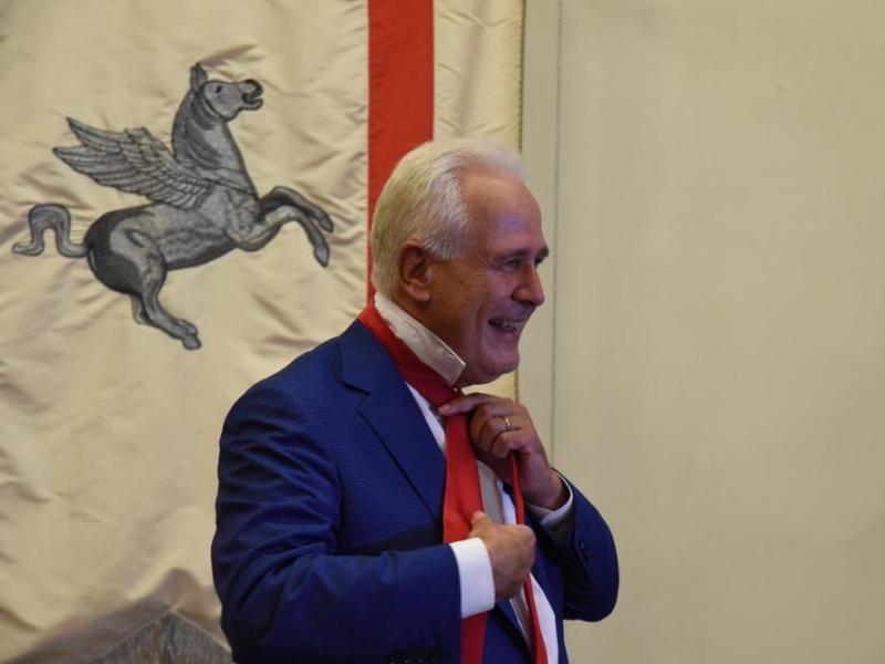 Una cravatta, rossa non a caso, come passaggio di testimone. Se la sfila dal collo della camicia il presidente uscente Enrico Rossi, che termina il suo doppio mandato lungo dieci anni alla guida della Toscana, e la indossa il neo presidente Eugenio Giani, oggi ufficialmente proclamato a due settimane e mezzo dalle elezioni del 20 e 21 settembre da cui è uscito vittorioso.