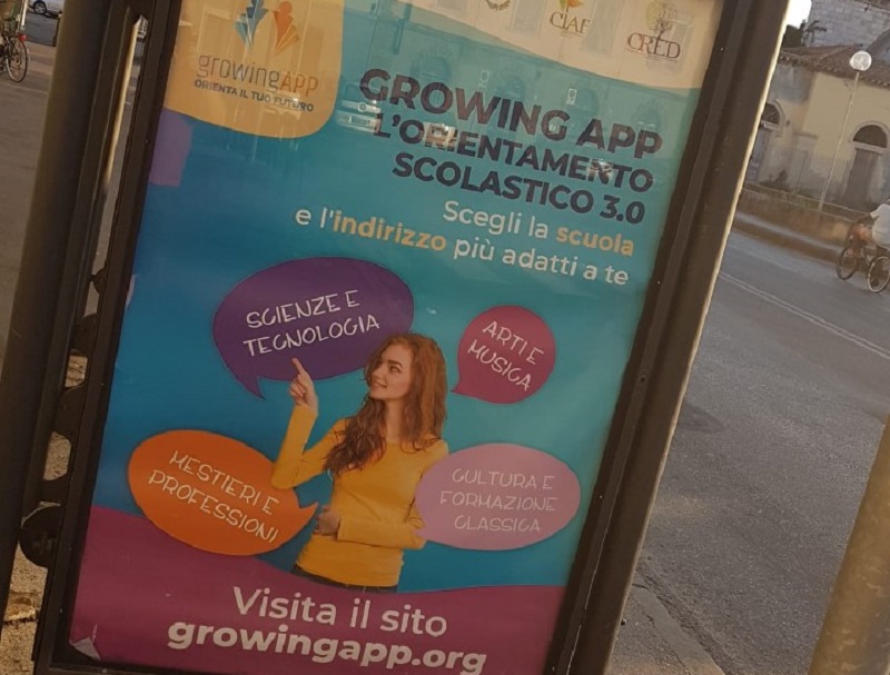 Per far conoscere maggiormente il progetto di orientamento scolastico è iniziata una campagna comunicativa che ha visto in questo ultimo mese la pubblicità del progetto ed un invito a visitare il sito della “GrowingApp” sulle pensiline degli autobus ( zona San Marco) e sui bus cittadini .