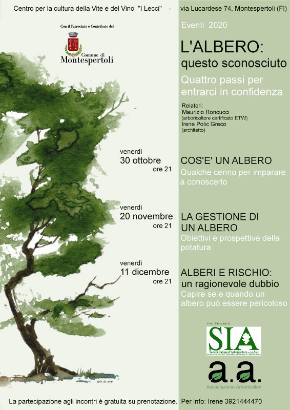 A partire da ottobre l'Associazione Arboricoltori e Società Italiana d'Arboricoltura organizzano un ciclo di conferenze dal titolo "L'albero: questo sconosciuto. Quattro passi per entrarci in confidenza", con il patrocinio e il contributo del Comune di Montespertoli. Si tratta di un ciclo che - comunicano gli organizzatori - intende cambiare la prospettiva con cui guardiamo all'albero, da oggetto a soggetto. L'obiettivo delle conferenze è affermare il principio per cui la gestione degli alberi è la