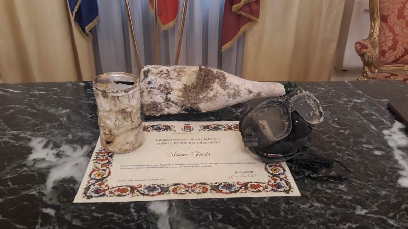 Sulla pergamena si legge: “L'Amministrazione Comunale di Livorno esprime il più sentito ringraziamento per lo straordinario intervento, in qualità di cittadino volontario, di raccolta rifiuti in occasione della mareggiata avvenuta in data 26 settembre 2020 al moletto di San Jacopo in Acquaviva”.