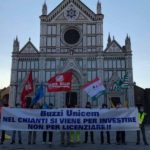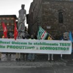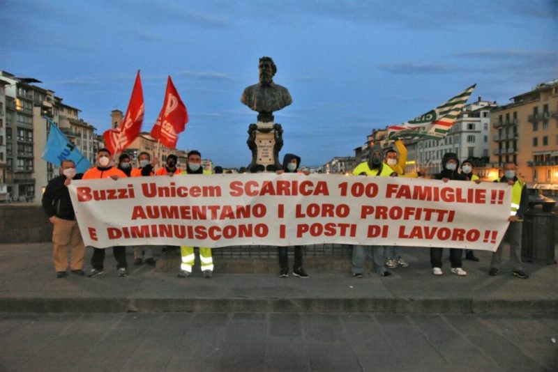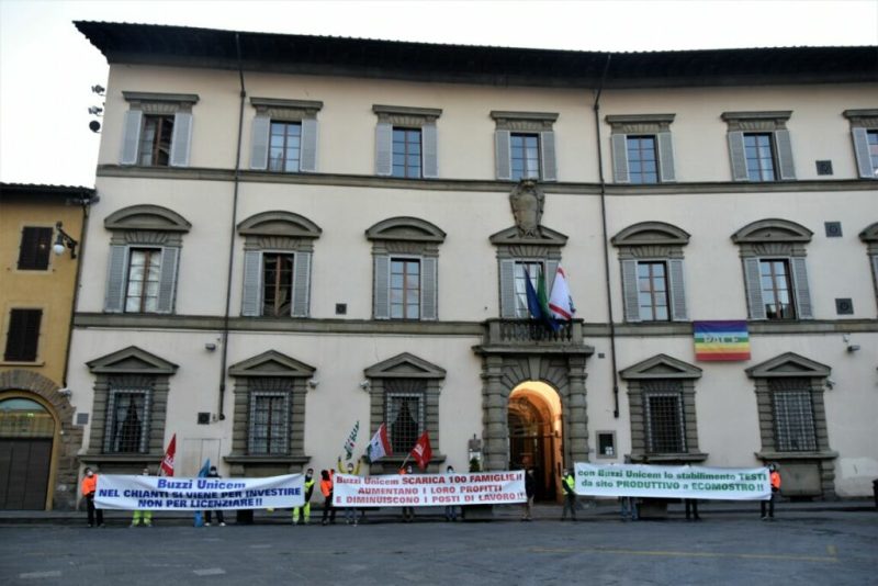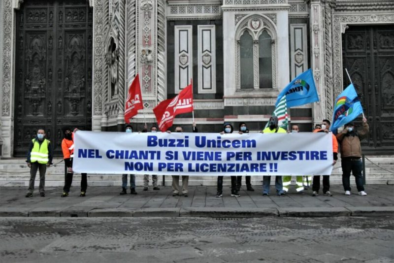 “Buzzi Unicem scarica 100 famiglie, aumentano i loro profitti e diminuiscono i posti di lavoro”, “Con Buzzi Unicem lo stabilimento Testi da sito produttivo a ecomostro”, “Buzzi Unicem, nel Chianti si viene per investire non per licenziare”: sono i tre striscioni che Fillea Cgil, Filca Cisl e Feneal Uil hanno esposto stamani in alcuni luoghi significativi di Firenze (Ponte Vecchio, piazza Signoria, piazza Santa Croce, piazza del Duomo) per tenere alta l’attenzione sulla vertenza del cementificio di Testi a Greve in Chianti, che lì dà lavoro a circa 100 persone (75 diretti, il resto nell’indotto) e rischia di chiudere. Nella tarda mattinata, per discutere della vertenza, le tre sigle (insieme a Cgil-Cisl-Uil) hanno incontrato l’azienda nella sede di Confindustria in via Valfonda sempre a Firenze: allo studio l’ipotesi di proroga della Cassa integrazione. Da oggi pomeriggio, per sensibilizzare istituzioni e cittadini sulla vertenza e al fine di trovare un percorso condiviso per la continuità di questo sito produttivo, lavoratori e sindacati sono in presidio permanente davanti allo stabilimento in via Testi (Passo dei Pecorai, Greve in Chianti: i gazebo sono stati sistemati all’inizio della SP 33 “Traversa di Testi”) che andrà avanti anche nei prossimi giorni, almeno finché non arriveranno riposte.