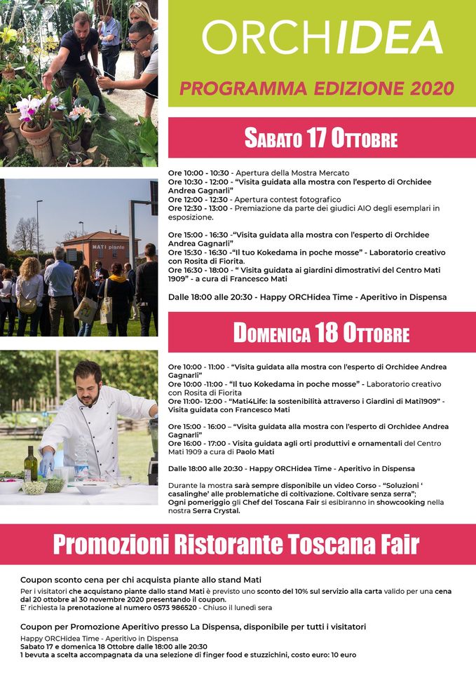 Per i due giorni di ORCHidea 2020 un ricco programma di eventi tra cui i laboratori creativi di Fiorita aperti su prenotazione a tutti gli interessati e la presentazione del libro “Fabulae plantarum e fabulae dei” di Paolo Luzzi Tav Editrice, un testo in cui i racconti della tradizione toscana si intrecciano a leggende sospese a metà tra mondo vegetale e fede.