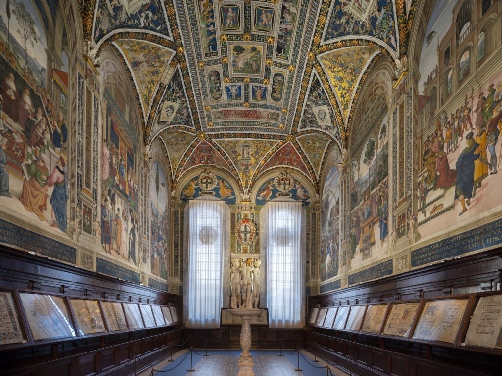 La biblioteca, costruita per onorare la memoria dello zio materno Enea Silvio Piccolomini (Papa Pio II) e conservare il ricco patrimonio “librario” che il pontefice ed umanista aveva raccolto, fu commissionata dal cardinale Francesco Tedeschini Piccolomini, arcivescovo di Siena (poi Papa Pio III), attorno al 1492. Adorna di affreschi eseguiti con ricchezza di colori smaltati e inserti in pastiglia dorata dal Pinturicchio e dalla sua bottega (1503-1508), le dieci scene che si susseguono nelle tre pareti celebrano la vita e il pontificato di Pio II. Alla loro ideazione collaborò anche Raffaello, del quale ricorre in questo anno il cinquecentesimo anniversario della morte