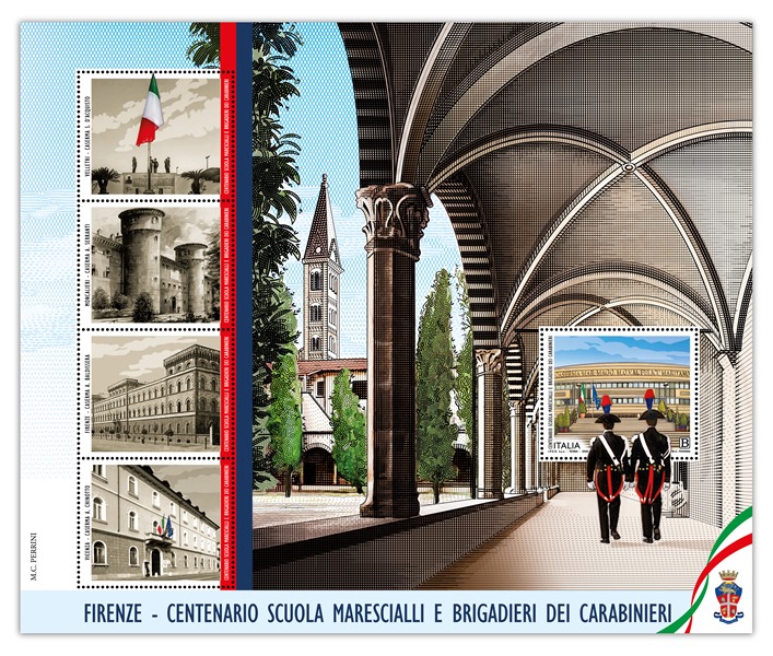 Completa il foglietto la leggenda “FIRENZE – CENTENARIO SCUOLA MARESCIALLI E BRIGADIERI DEI CARABINIERI”; completano i chiudilettera la leggenda “CENTENARIO SCUOLA MARESCIALLI E BRIGADIERI” e le rispettive leggende “VICENZA - CASERMA A. CHINOTTO”, “FIRENZE - CASERMA A. BALDISSERA”, “MONCALIERI – CASERMA A. SERRANTI” e “VELLETRI – CASERMA S.D’ACQUISTO”.