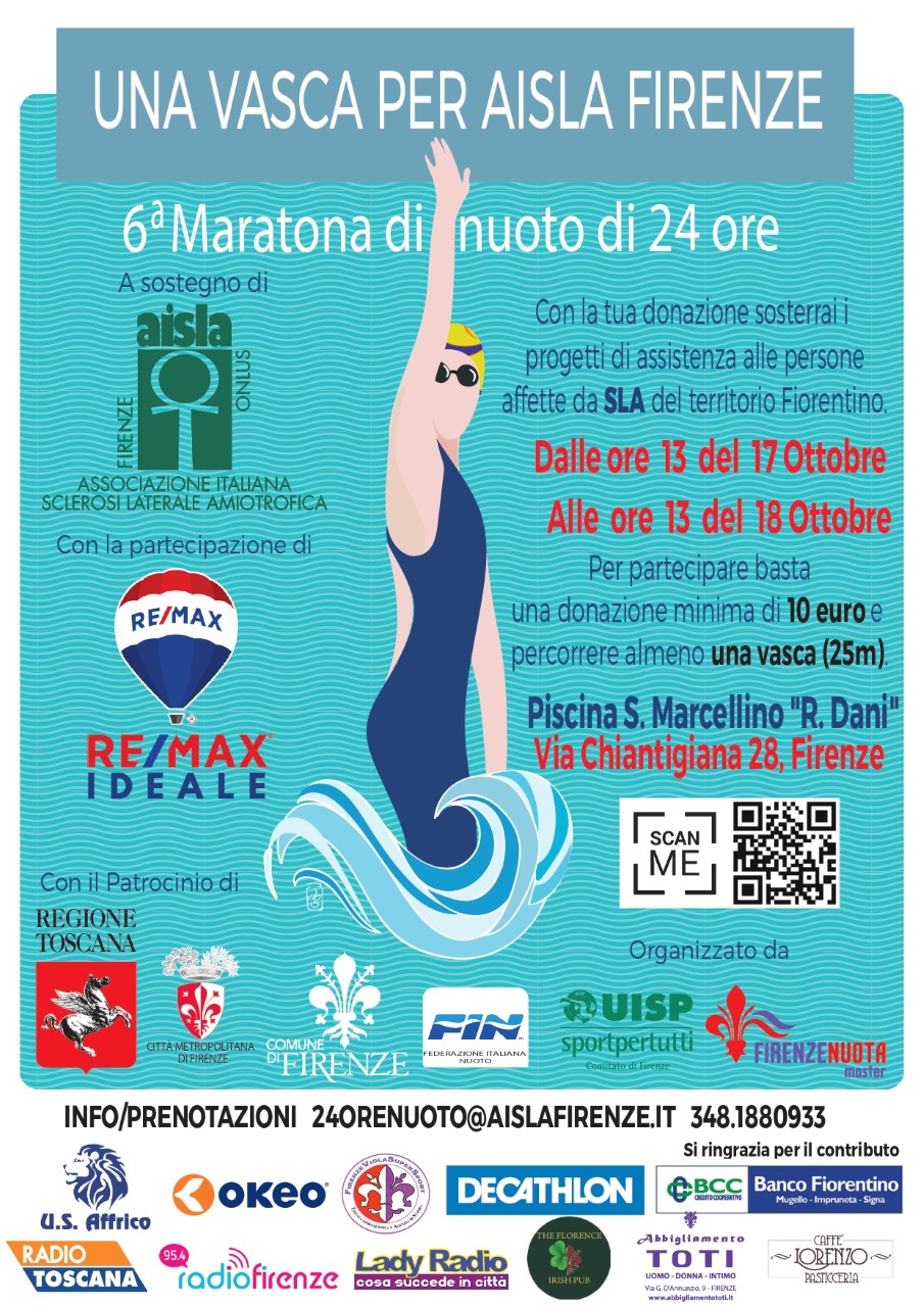 AISLA Firenze si prepara all’evento più atteso: la maratona di ventiquattrore di nuoto “Una vasca per AISLA Firenze”. Prevista originariamente a marzo e poi annullata per l’emergenza, è adesso in calendario sabato 17 e domenica 18 ottobre, non alla piscina Paganelli, come di consueto, ma a San Marcellino (via Chiantigiana n.28), impianto in concessione alla Polisportiva U.S. Affrico, spesso promotore di iniziative di beneficenza analoghe che rimarcano la grande valenza sociale dello sport dilettantistico. Inizio ore 13 di sabato 17 ottobre.