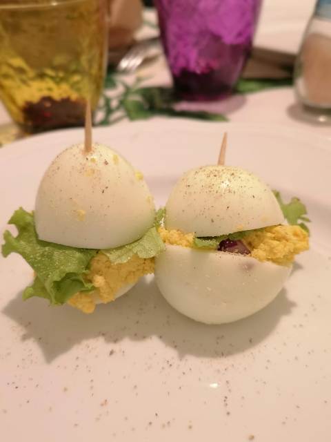Uova farcite in salsa di tuorli e cavolo cappuccio