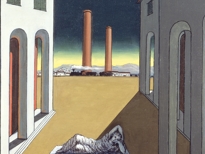 De Chirico immagina vedute di città antiche che si sovrappongono a visioni di città moderne riprese da luoghi di vita vissuta, prima Volos e Atene, poi Monaco di Baviera, Milano, Firenze, Torino, Parigi, Ferrara, New York, Venezia, Roma. Sono luoghi in cui lo spazio pubblico disabitato dall’uomo viene popolato da oggetti – frammenti, rovine, archi, portici, angoli di strade, muri, edifici, torri, ciminiere, treni, statue, manichini – che estraniati dal loro abituale contesto emergono con tutta la loro forza iconica diventando irreali, misteriosi, enigmatici.