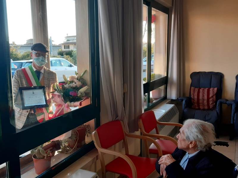 Anche in tempo di pandemia e di distanziamento interpersonale, il sindaco Alessio Spinelli non ha voluto rinunciare a festeggiare i 100 anni di una propria concittadina. Ed allora il primo cittadino fucecchiese ha raggiunto la Residenza Sanitaria Assistita "Le Vele" e, seppur attraverso un vetro, ha portato il proprio omaggio floreale e una targa ricordo alla signora Maria Tavano che ieri ha raggiunto il traguardo di un secolo di vita. Un gesto che, in questo momento particolarmente difficile, ha sorpreso la signora Maria e le persone presenti. Il sindaco ringrazia la direzione dell' Rsa, il direttore Francesco Fariello e il coordinatore Nicola Biondi, per la disponibilità mostrata e, insieme a loro ringrazia tutto il personale de "Le Vele" che anche in questa seconda fase della pandemia sta mettendo tutto il proprio impegno e la propria professionalità al servizio dei degenti.
