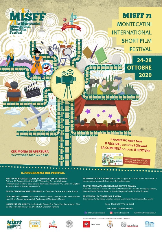 Parte ufficialmente l’edizione 2020 del MISFF – Montecatini International Short Film Festival: l’inaugurazione della kermesse cinematografica diretta da Marcello Zeppi è prevista per sabato 24 ottobre alle Terme Tettuccio (alle ore 18) con una cerimonia che sarà trasmessa su TVL Pistoia, media partner della manifestazione per questa speciale edizione multimediale del MISFF. Inaugura ufficialmente l’apertura del Festival Federica Pinochi, Assessore al Turismo, Eventi e Innovazione Digitale del Comune di Montecatini.
