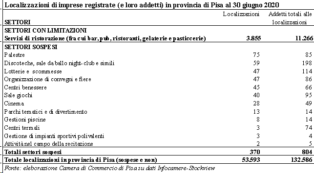 Sono numeri consistenti quelli delle imprese e dei lavoratori coinvolti dalle limitazioni imposte dal DPCM 24 ottobre 2020 frutto a sua volta dell’acuirsi della pandemia da covid-19. Secondo una prima analisi dei settori elencati dal provvedimento i dati del sistema Infocamere-Stockview e relativi alle localizzazioni (sedi, sedi secondarie, magazzini, uffici, ecc.) e relativi lavoratori alla provincia di Pisa al 30 giugno 2020 evidenziano come quasi 400 imprese, che danno lavoro a 800 persone, abbiano dovuto sospendere la loro attività.