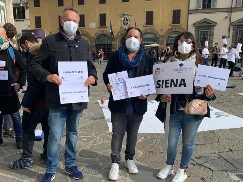 Anche Siena partecipa alla protesta pacifica di che Fipe-Confcommercio ha organizzato oggi, 28 ottobre. Il settore della ristorazione ha manifestato anche a Firenze in piazza del Duomo.