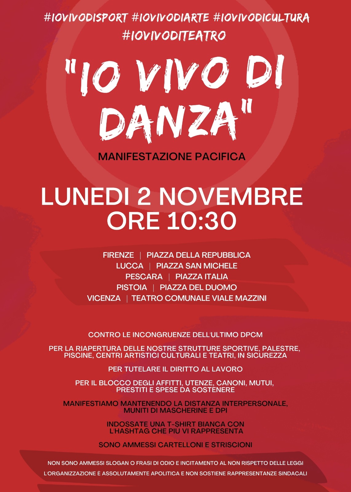Alla luce delle disposizioni previste dall’ultimo DPCM che penalizzano tutto il comparto culturale e quello dello sport, abbiamo indetto una manifestazione di protesta per rivendicare il diritto al lavoro degli operatori culturali e sportivi e il diritto della cittadinanza di fruire del movimento, dello sport, della danza, della cultura , dell'arte per preservare la propria salute fisica e mentale.