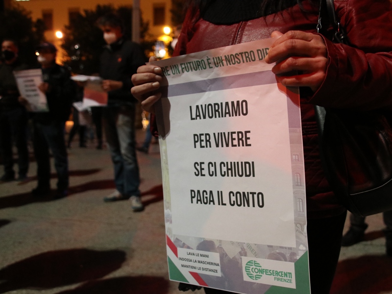 Alle 18.30 si trovavano alle porte del centro storico di Empoli centinaia di persone comprese forze politiche, da Csa Intifada che ha aperto il raduno di protesta parlando alla folla, ai partiti di centrodestra e altri esponenti presenti in silenzio tra chi rivendicava il proprio lavoro. Confesercenti e lavoratori si sono poi spostati poco più avanti, di fronte alla sede dell'Unione dei Comuni dell'Empolese Valdelsa, e la piazza si è di fatto spaccata in due. Tra le siepi e i fiori dietro la dea Vittoria illuminata in rosso, Franco Brogi presidente Fiepet Toscana, Claudio Bianchi presidente Confesercenti Firenze e Gianluca D'Alessio responsabile Confesercenti Empolese Valdelsa, hanno proseguito circondati dai partecipanti.