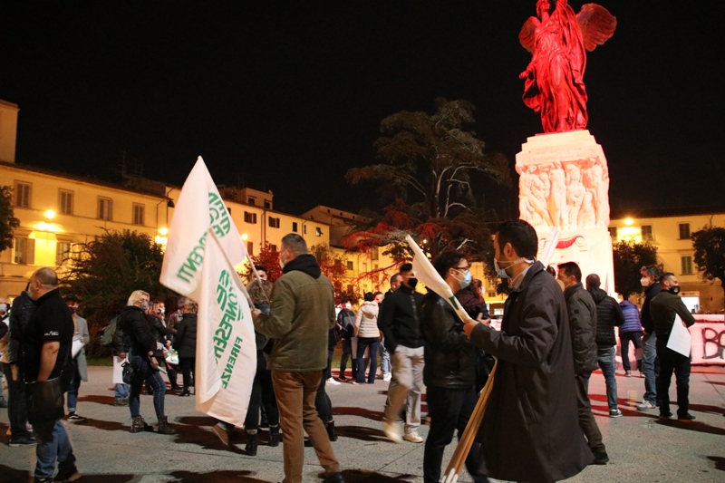 Alle 18.30 si trovavano alle porte del centro storico di Empoli centinaia di persone comprese forze politiche, da Csa Intifada che ha aperto il raduno di protesta parlando alla folla, ai partiti di centrodestra e altri esponenti presenti in silenzio tra chi rivendicava il proprio lavoro. Confesercenti e lavoratori si sono poi spostati poco più avanti, di fronte alla sede dell'Unione dei Comuni dell'Empolese Valdelsa, e la piazza si è di fatto spaccata in due. Tra le siepi e i fiori dietro la dea Vittoria illuminata in rosso, Franco Brogi presidente Fiepet Toscana, Claudio Bianchi presidente Confesercenti Firenze e Gianluca D'Alessio responsabile Confesercenti Empolese Valdelsa, hanno proseguito circondati dai partecipanti.
