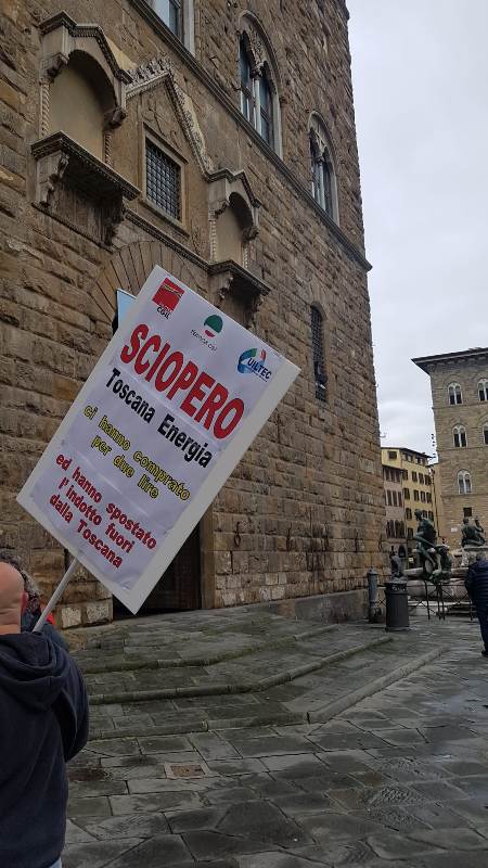 Il presidio era stato organizzato in occasione delle 4 ore di sciopero proclamate dai sindacati (alta l’adesione), per protestare contro le scelte del socio di maggioranza, Italgas, di portare fuori da Toscana Energia alcune attività strategiche, come quelle di finanza, amministrazione, bilancio, acquisti, tributi, personale, immobiliare, ict, regolazione e tariffe, sviluppo commerciale gare, legale, audit tecnici e interni, che finora sono state svolte da personale interno: 51 addetti sui 440 dipendenti totali.