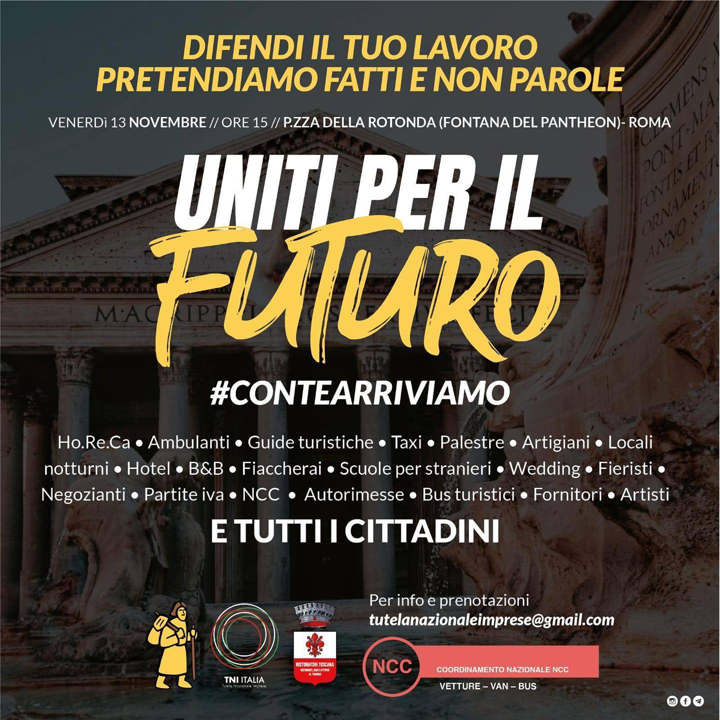 La Camminata degli Inessenziali, partita il 4 novembre da Ponte Vecchio a Firenze, si concluderà venerdì 13 novembre, al Pantheon di Roma intorno alle 15. Alla manifestazione, promossa dal gruppo Ristoratori Toscana insieme a Tni-Tutela Nazionale Imprese, sono attesi i ristoratori, sono una sessantina quelli che arriveranno a Roma, circa cento Ncc provenienti dalle zone gialle d'Italia ma anche albergatori, ambulanti, partite Iva e lavoratori dello spettacolo, sempre provenienti dalle zone gialle. Insieme sono determinati a farsi ascoltare dal premier Giuseppe Conte al quale ribadiranno le loro richieste.