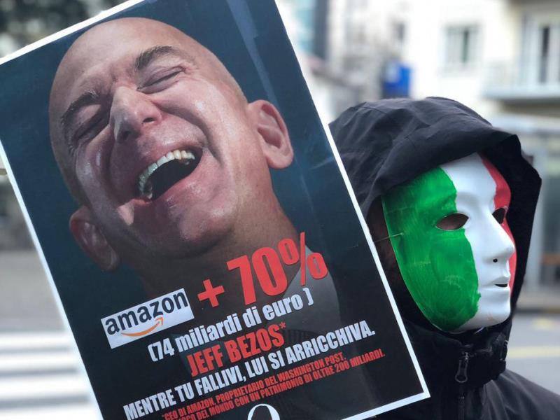 “Mentre l’Italia collassa, Amazon ingrassa”. E’ questo lo striscione esibito davanti a agli uffici e ai centri distribuzione Amazon. Decine di “blitz” pacifici, tra cui una delegazione di Grosseto presentatasi a Firenze con bandiere tricolori e cartelli con il volto gaudente di Jeff Bezos, per denunciare l’ulteriore squilibrio causato dall’emergenza Covid-19. Da una parte centinaia di migliaia di piccole e medie attività rischiano di chiudere per sempre a causa di lockdown, restrizioni e assenza di un vero sostegno da parte del governo, dall’altra le grandi multinazionali che sfruttano la crisi per raddoppiare il fatturato. Esemplare il caso dei giganti del web: Jeff Bezos (Amazon) ha incrementato il proprio patrimonio personale di circa 74 miliardi (+70%) e ora conta su un patrimonio personale di oltre 200 miliardi, Bill Gates (Microsoft) passa da 98 miliardi a 118 (+20,4%), Mark Zuckerberg (Facebook) da 54,7 a 97,7 (+ 78%), Eric Yuan (Zoom) da 5,5 a 24,7 miliardi (+349%).