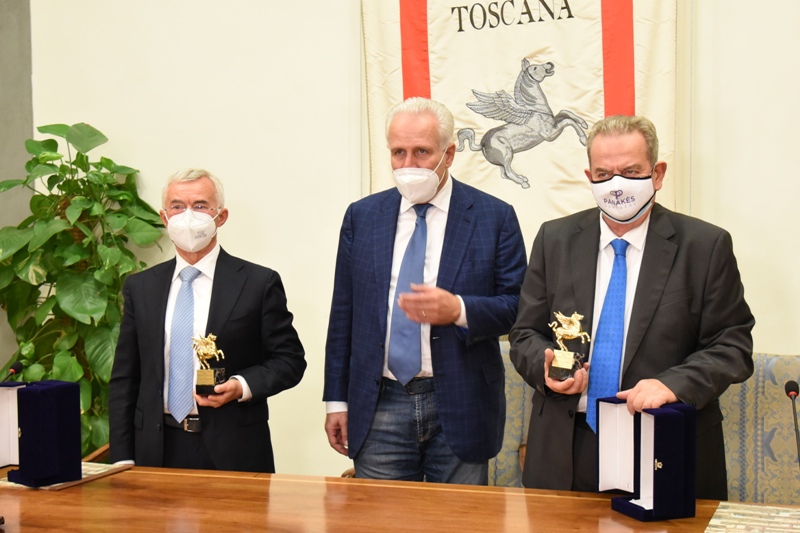 Il presidente della Regione, Eugenio Giani, questa mattina ha consegnato il Pegaso d’oro a Fabrizio Landi, presidente della Fondazione Toscana Life Sciences (TLS) e al “padre dei vaccini moderni” Rino Rappuoli, scienziato che coordina il Mad (Monoclonal Antibody Discovery) Lab. Con Giani l’assessore regionale alla sanità, Simone Bezzini che esprime “soddisfazione e apprezzamento per questo straordinario risultato”. Sono intervenuti alla cerimonia anche il presidente e il vicepresidente del Consiglio regionale, Antonio Mazzeo e Stefano Scaramelli.