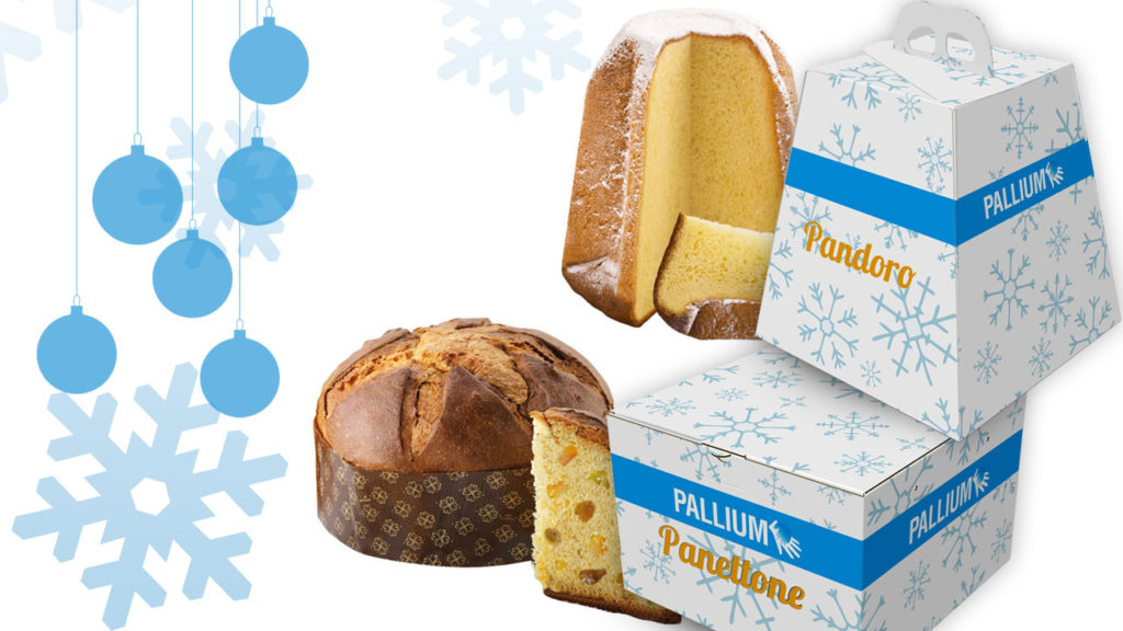 Il panettone Pallium (1 kg) è proposto nella sua classica forma bassa, arricchito con uvetta e canditi; il pandoro Pallium (1 kg), dolce soffice e profumato come da tradizione, nella tipica forma di stella a otto punte.