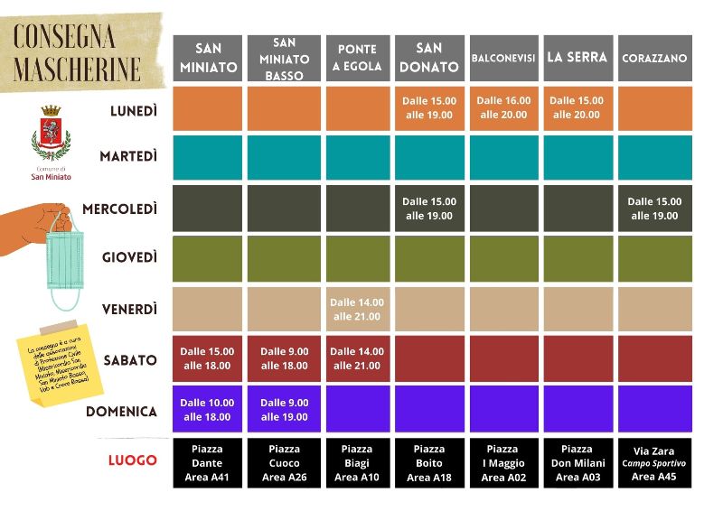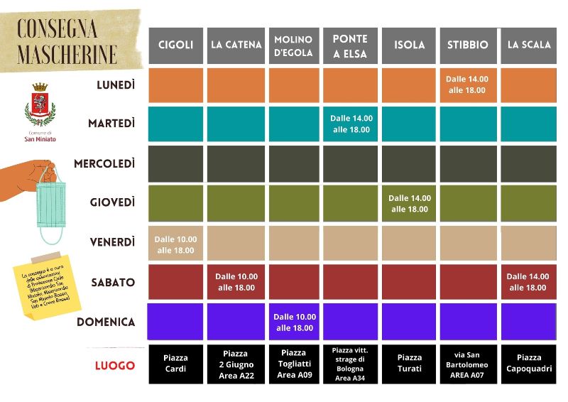 Ecco il calendario della consegna: venerdì 20 novembre, dalle 15.00 alle 18.00, e sabato 21 novembre, dalle 10.00 alle 18.00, in Piazza Alighieri a San Miniato; sabato dalle 9.00 alle 18.00 e domenica, dalle 9.00 alle 19.00, in piazza Cuoco a San Miniato Basso; venerdì, dalle 14.00 alle 21.00, e sabato, dalle 14.00 alle 21.00, in Piazza Biagi a Ponte a Egola; lunedì e mercoledì, dalle 15.00 alle 19.00, in piazza Boito a San Donato; lunedì, dalle 16.00 alle 20.00, in piazza I Maggio a Balconevisi; lunedì, dalle 15.00 alle 20.00, in piazza Don Milani (davanti al tendone) a La Serra; mercoledì, dalle 15.00 alle 19.00, al campo sportivo in via Zara a Corazzano; venerdì, dalle 10.00 alle 18.00, in piazza Cardi a Cigoli; sabato, dalle 10.00 alle 18.00, in piazza 2 Giugno a La Catena; domenica, dalle 10.00 alle 18.00, in piazza Togliatti a Molino d'Egola; martedì, dalle 14.00 alle 18.00, in piazza vittime della strage di Bologna a Ponte a Elsa; giovedì, dalle 14.00 alle 18.00, in piazza Turati a Isola; lunedì, dalle 14.00 alle 18.00, in via San Bartolomeo a Stibbio e sabato, dalle 14.00 alle 18.00, in piazza Capoquadri a La Scala.